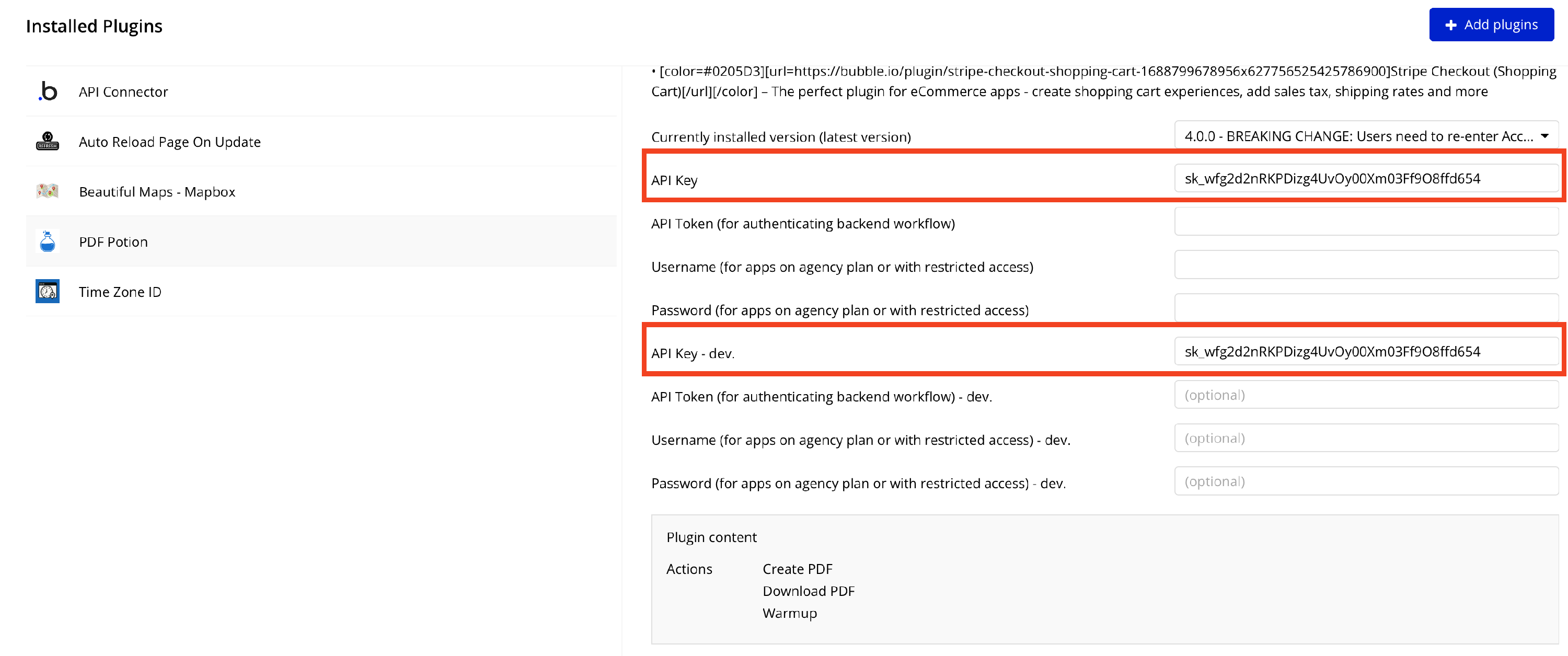 Copy and paste this access token into the 'API Key' and 'API Key - dev.' fields in the 'Plugins' tab: