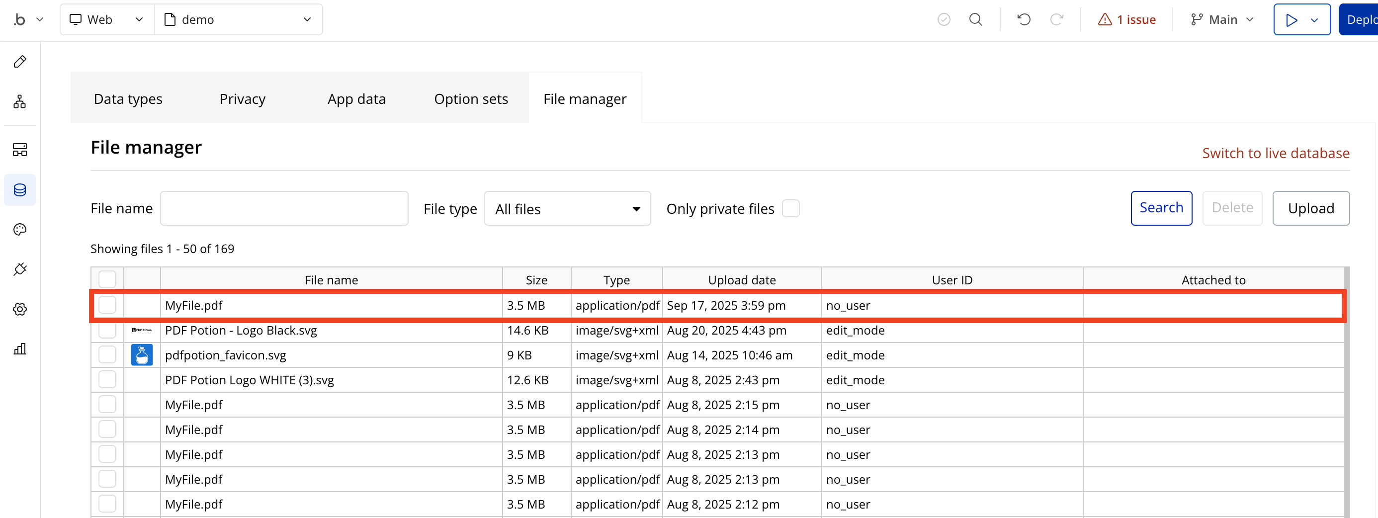 Note: It can take a few seconds for DocuPotion to generate the PDF and send it back to your Bubble database, so you may need to refresh the file manager for the file to appear.