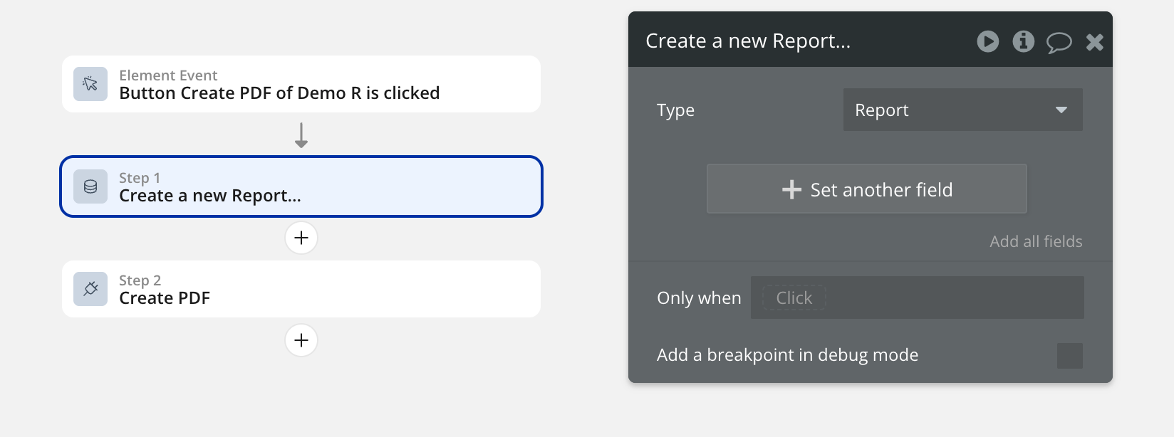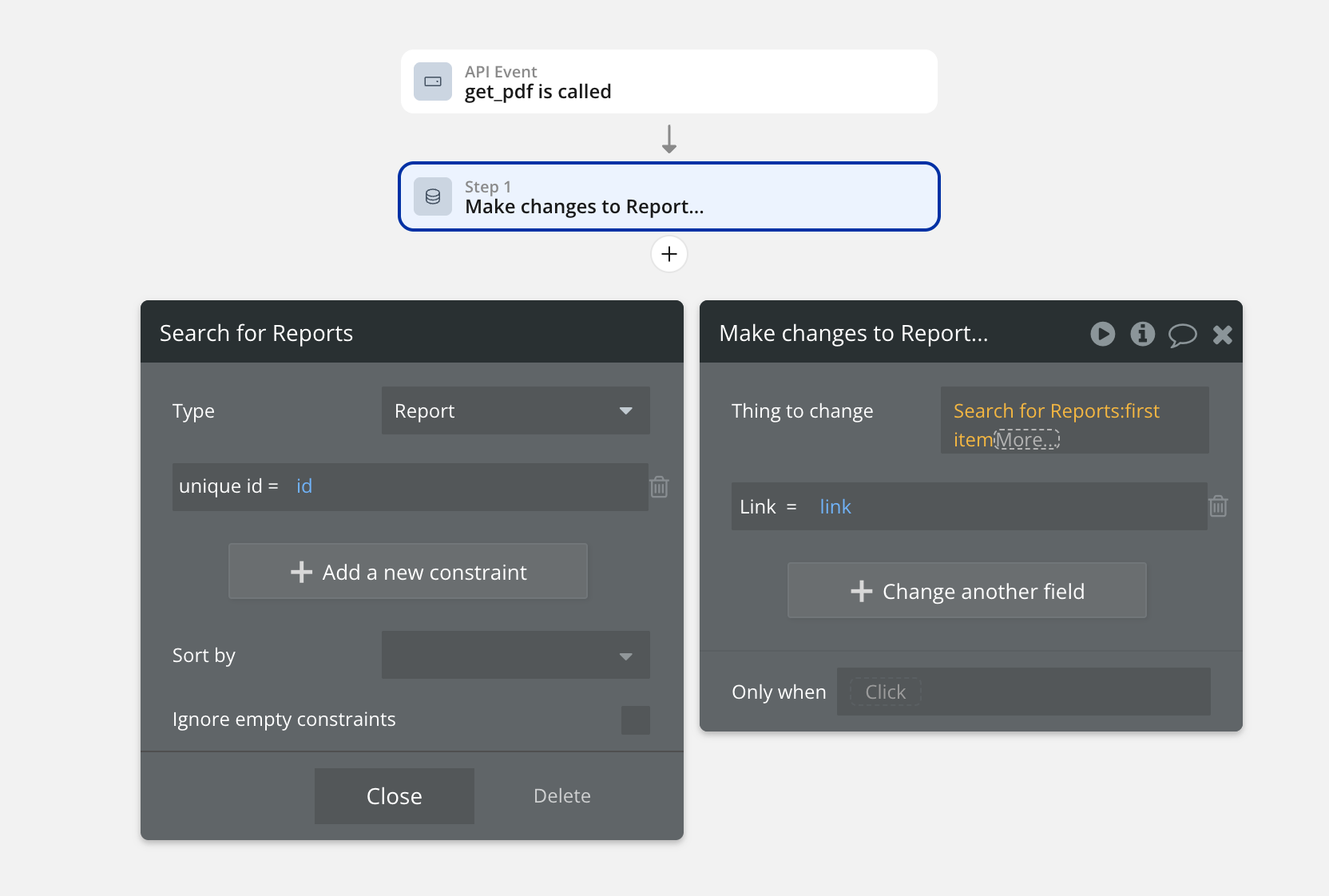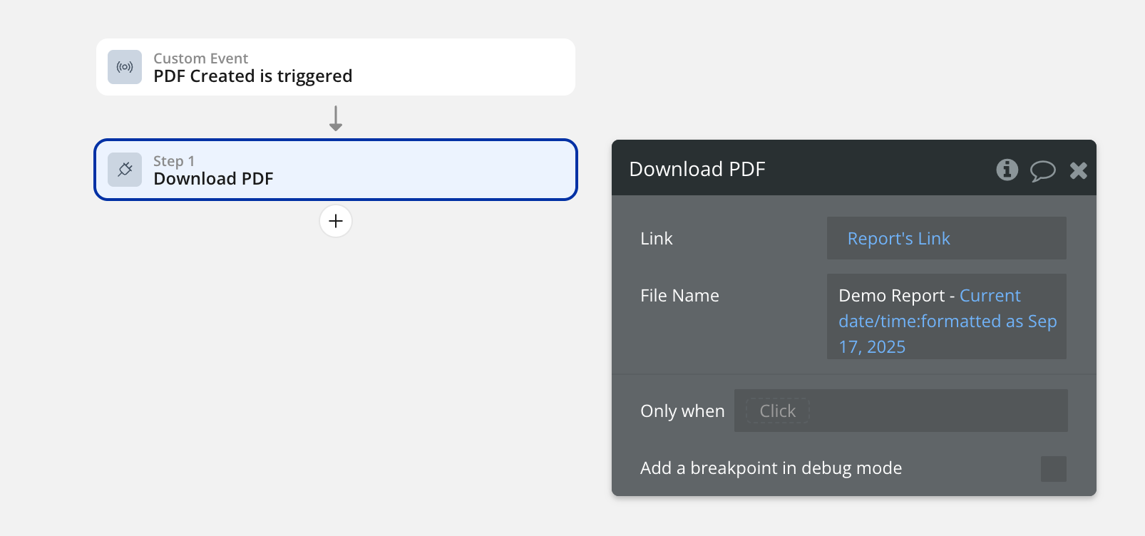 - Add the 'Download PDF' action to this workflow and set the 'link' field equal to 'Report's Link' (or whatever you're using for the custom data type and link) and the File name to whatever you want