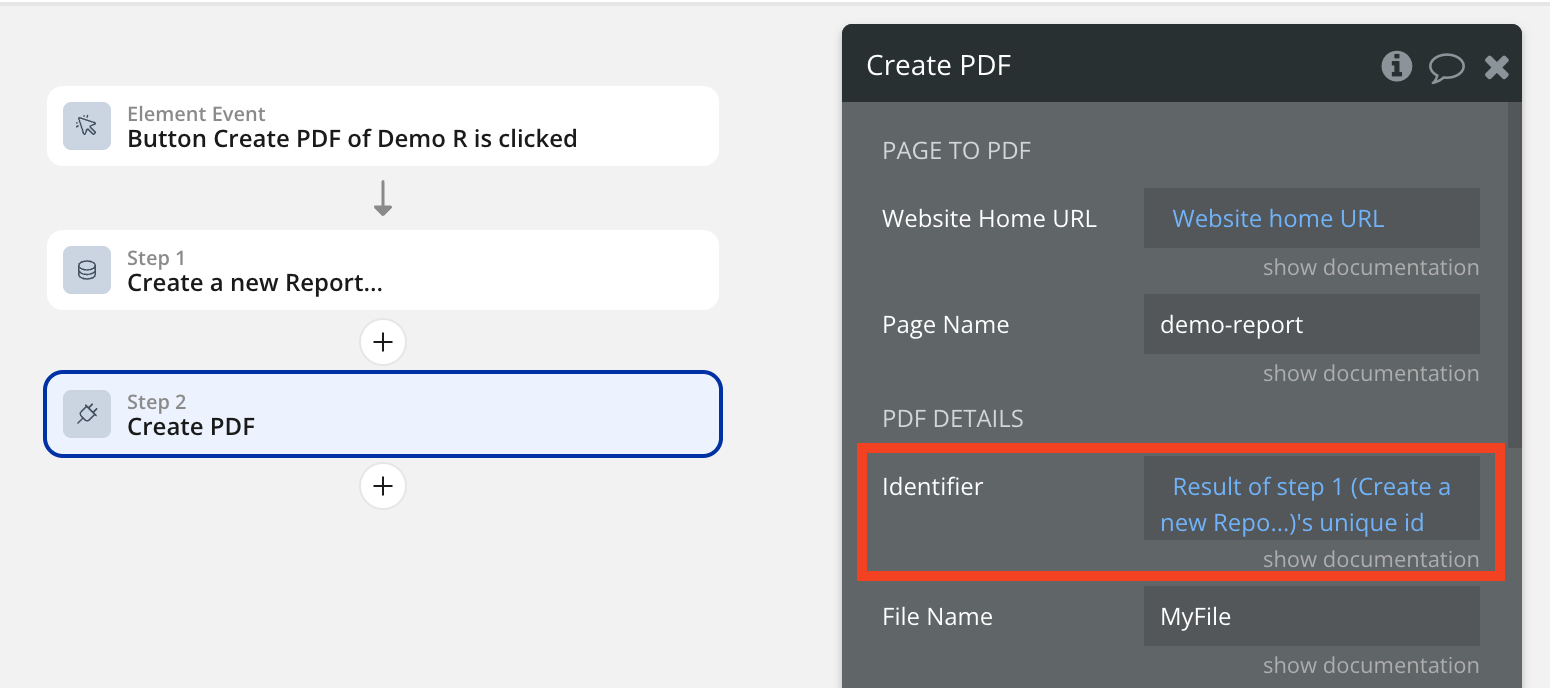 You do not need to change any fields when initially creating the 'Report' (or whatever custom data type you're using). The key is that we're able to use the unique ID associated with the 'Report' for the Identifier field in the 'Create PDF' workflow action: