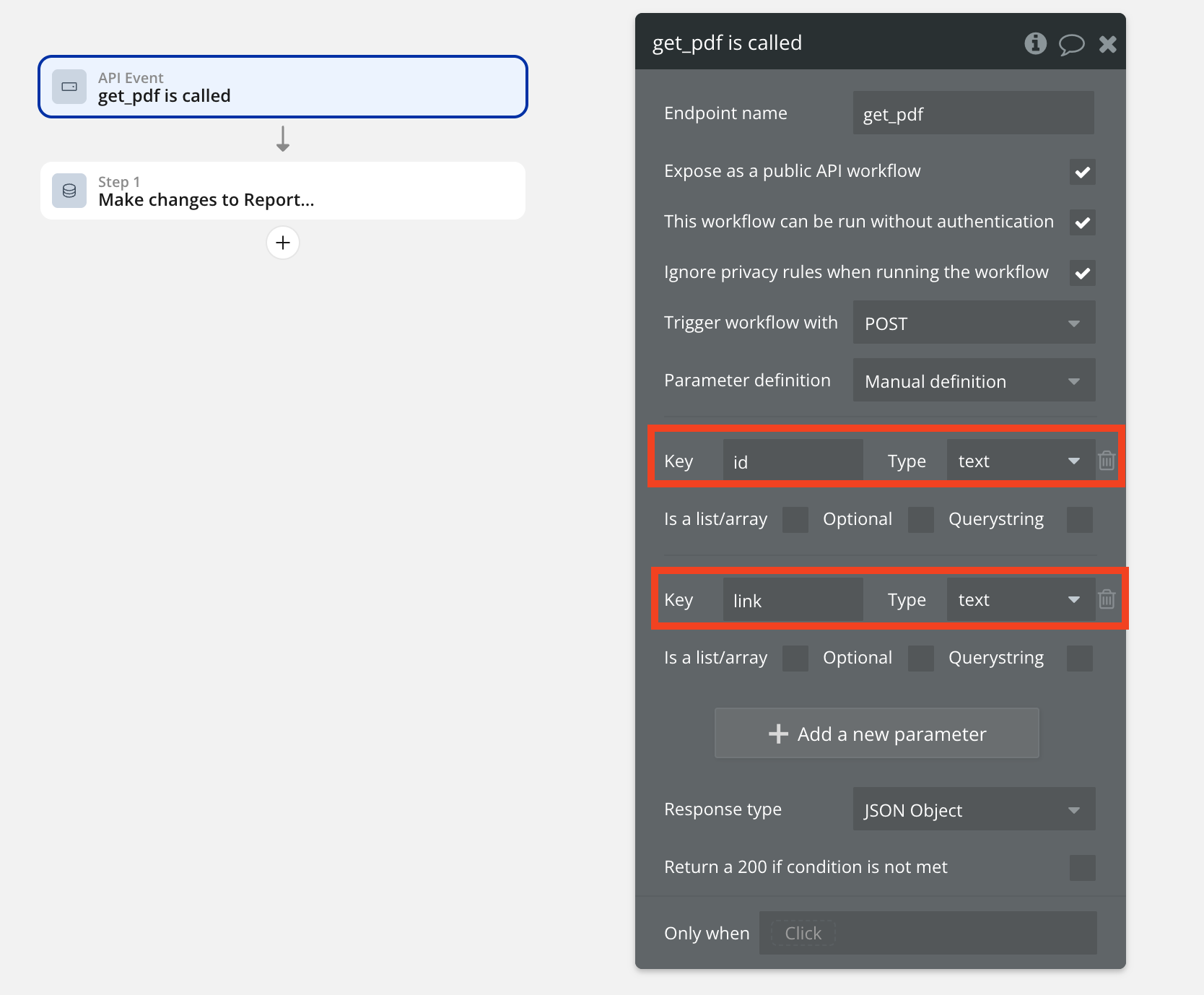 Create a backend workflow (I've called mine 'get_pdf') and add two Key values: id and link (both of text)