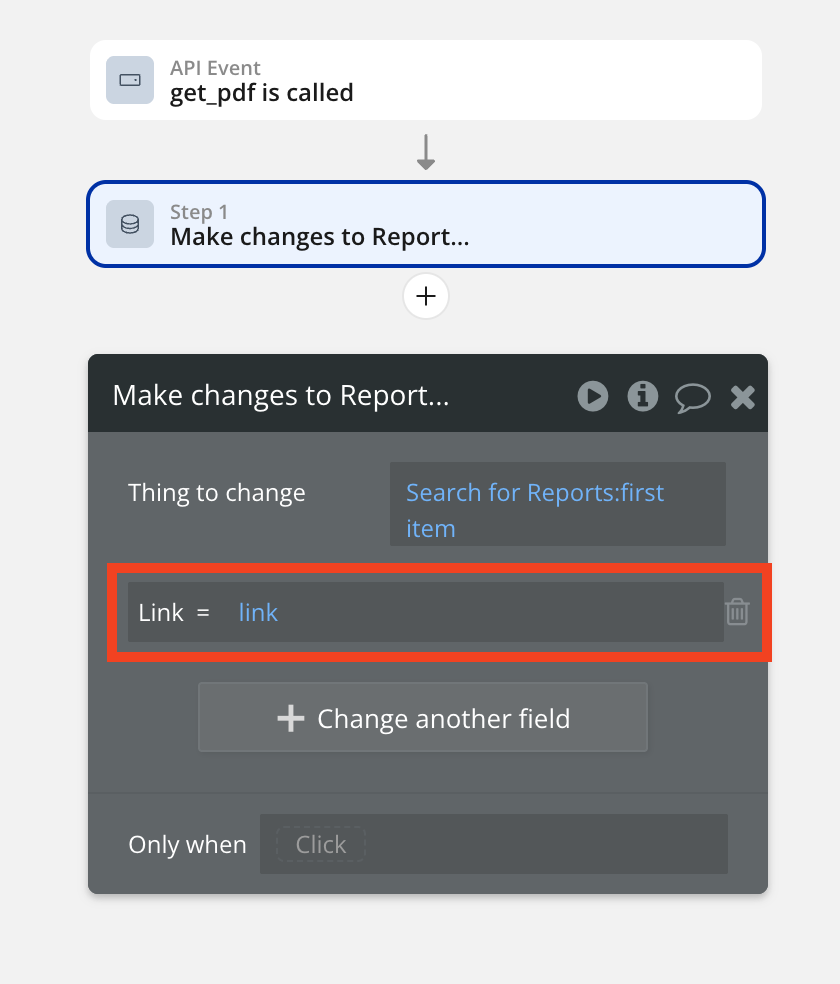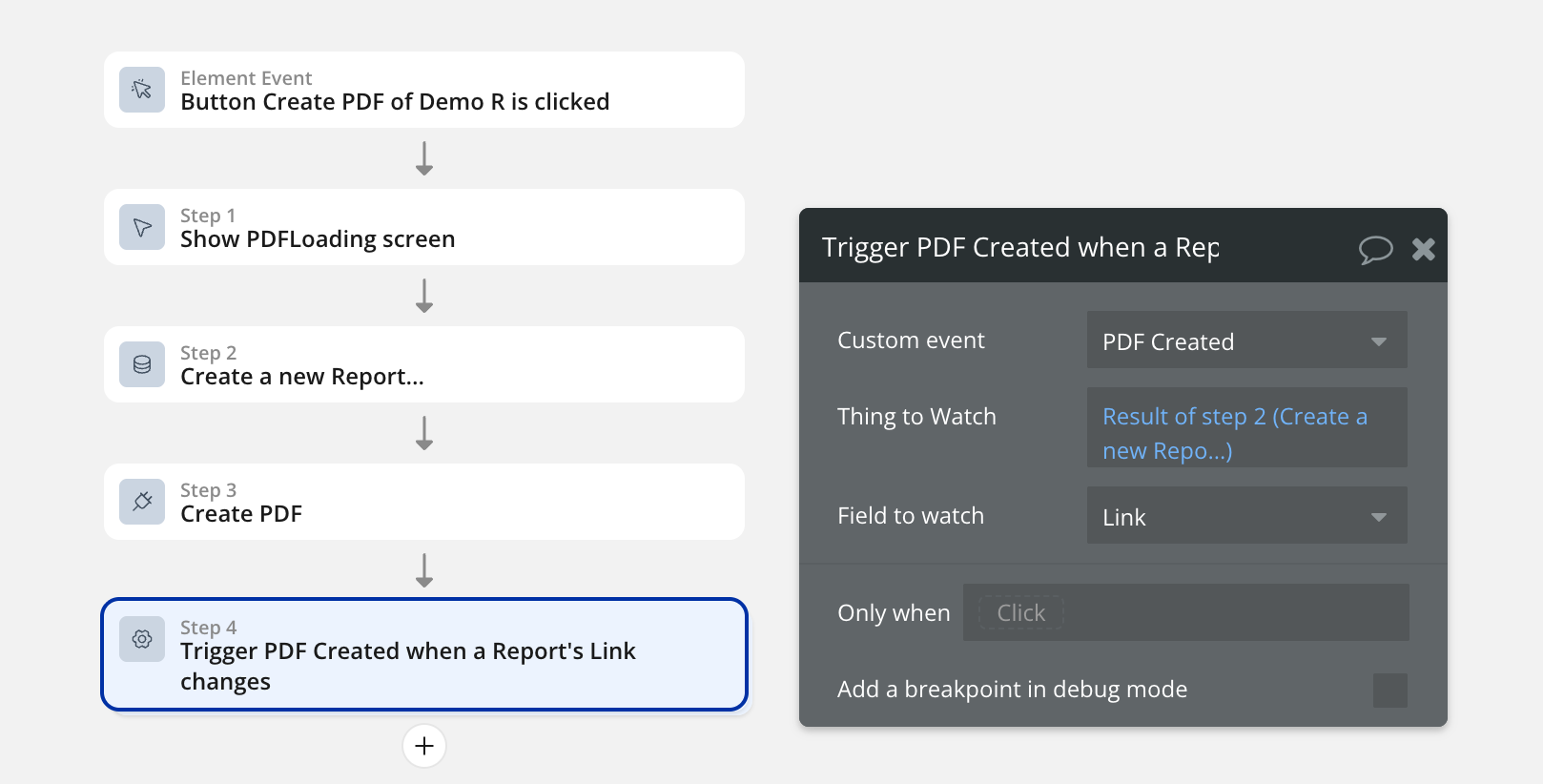 - The 'Thing to watch' is the 'Report' (or whatever custom data type you're using) that you created in step 1 of the workflow and the 'Field to watch' is 'Link' (or whatever field you're using to store the URL to the PDF)