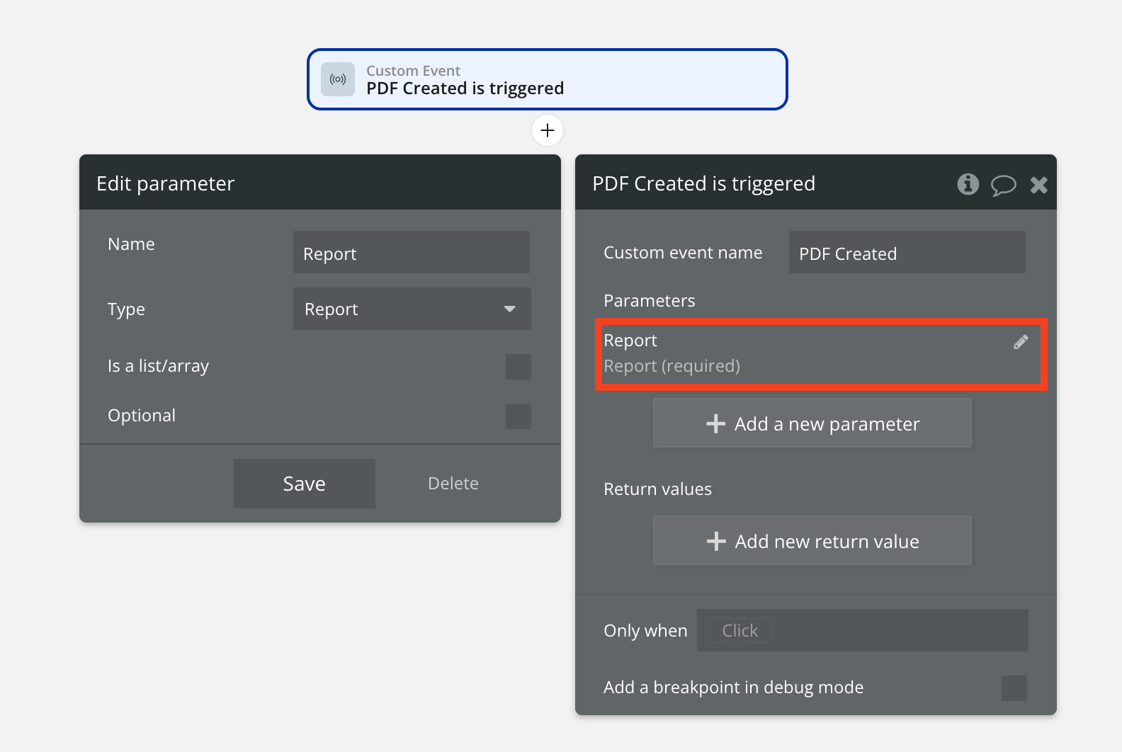 - Add a parameter to the custom event called 'Report' (or similar) with the type of data equal to whatever custom data type you're using to link to the PDF