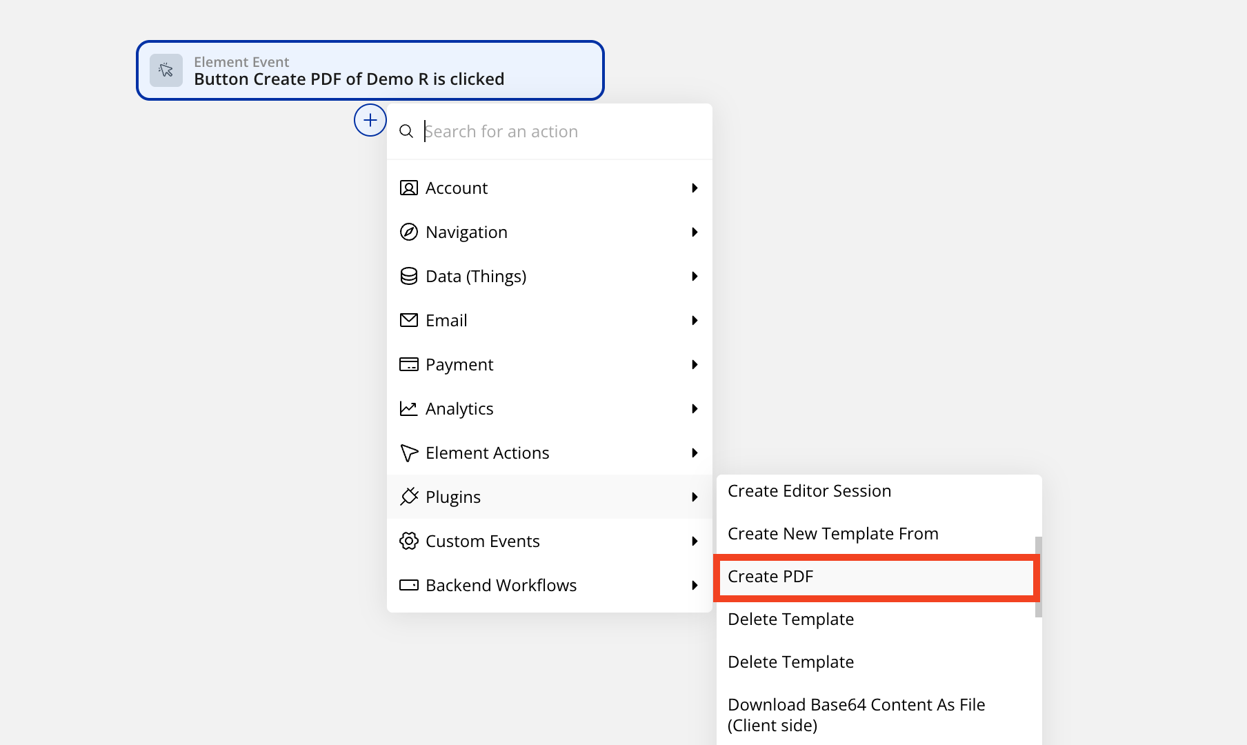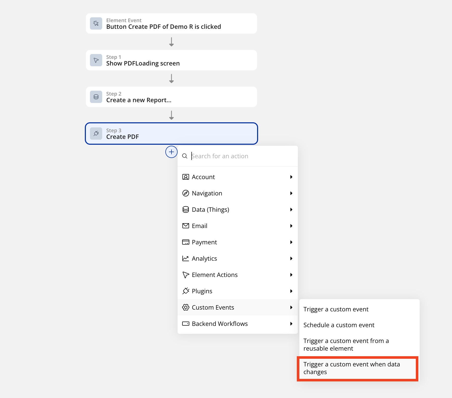 - To do this, add a 'Trigger custom event when data changes' action to the original workflow that had the 'Create PDF' action