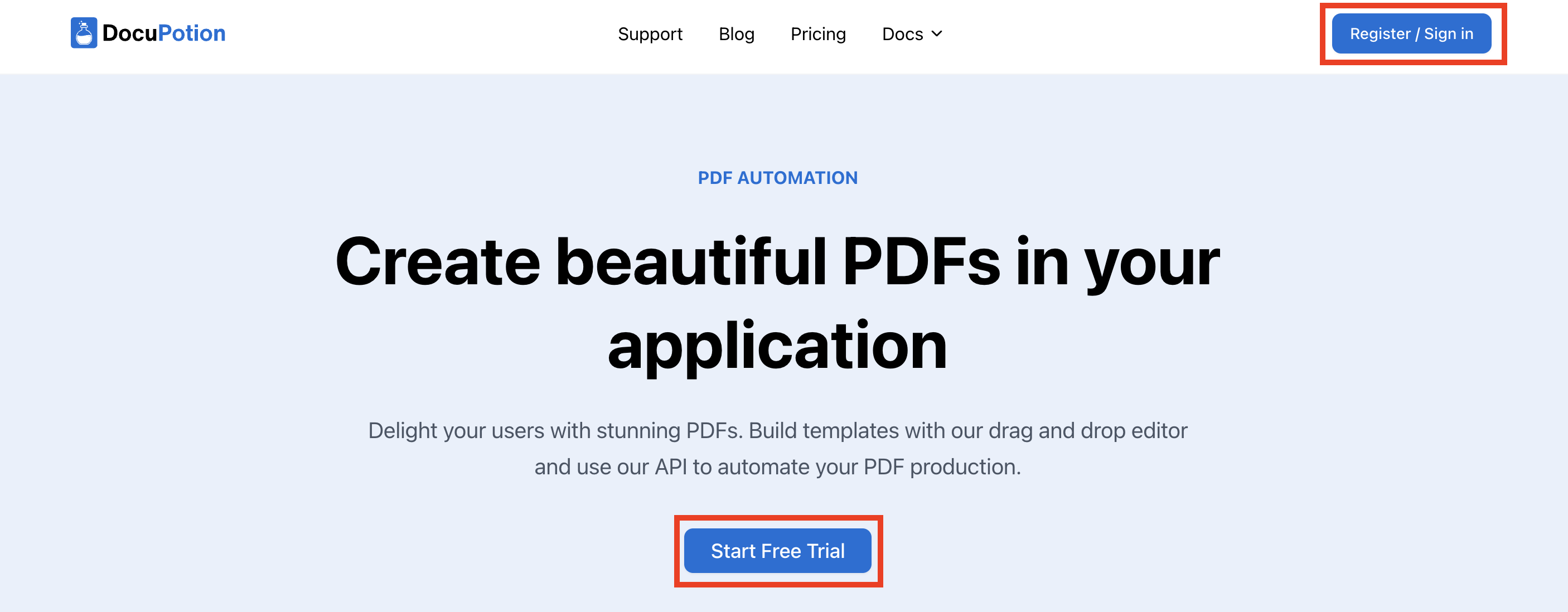 Navigate to the DocuPotion homepage and click on the 'Register / Sign in' or 'Start Free Trial' button.