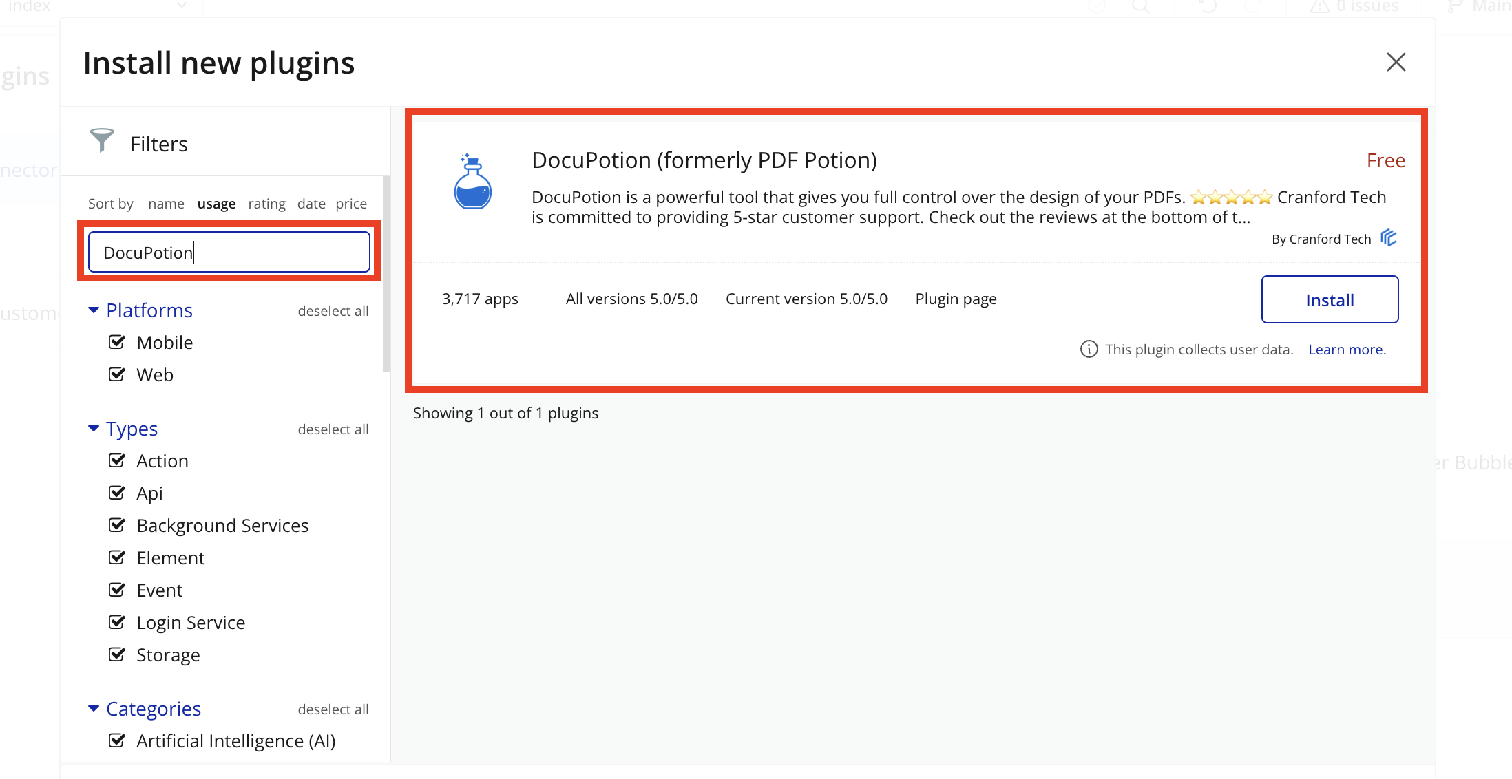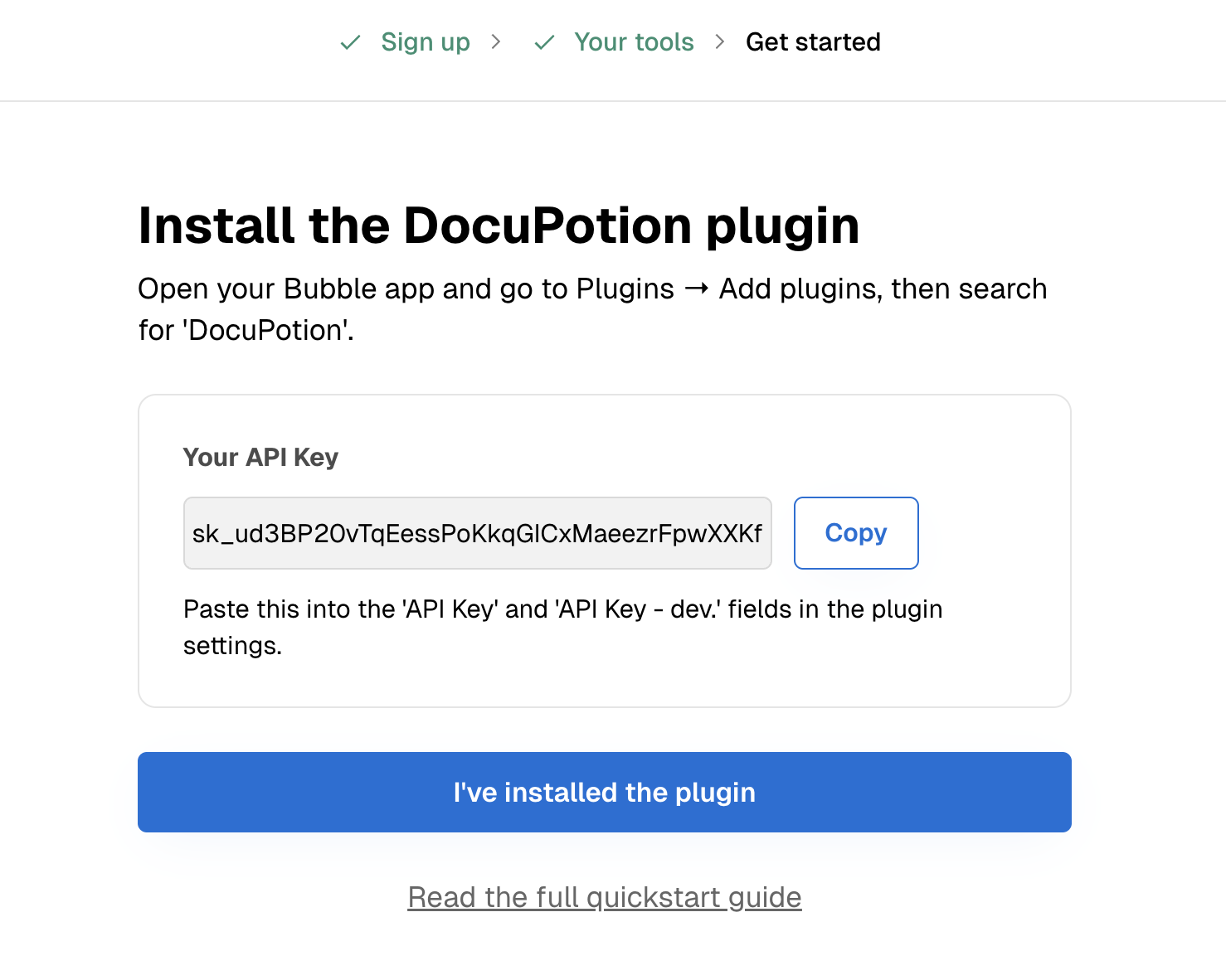 Go the 'plugins' tab in the editor of the Bubble app that you're using DocuPotion in. Search for DocuPotion and install the free plugin.