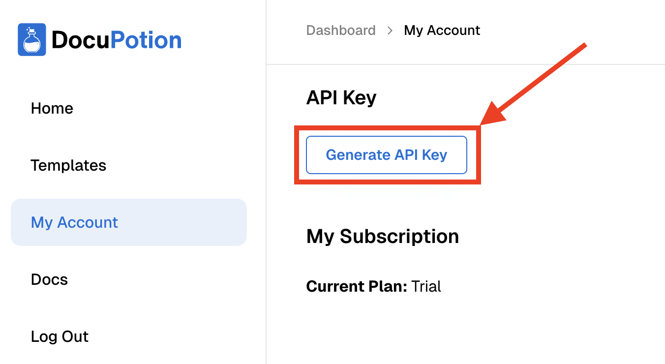 Once you've installed the plugin, you'll need to add your unique API Key to DocuPotion in the 'plugins' tab. To get your API Key, go back to your DocuPotion dashboard and navigate to the 'My Account' tab and click on the 'Generate API Key' button: