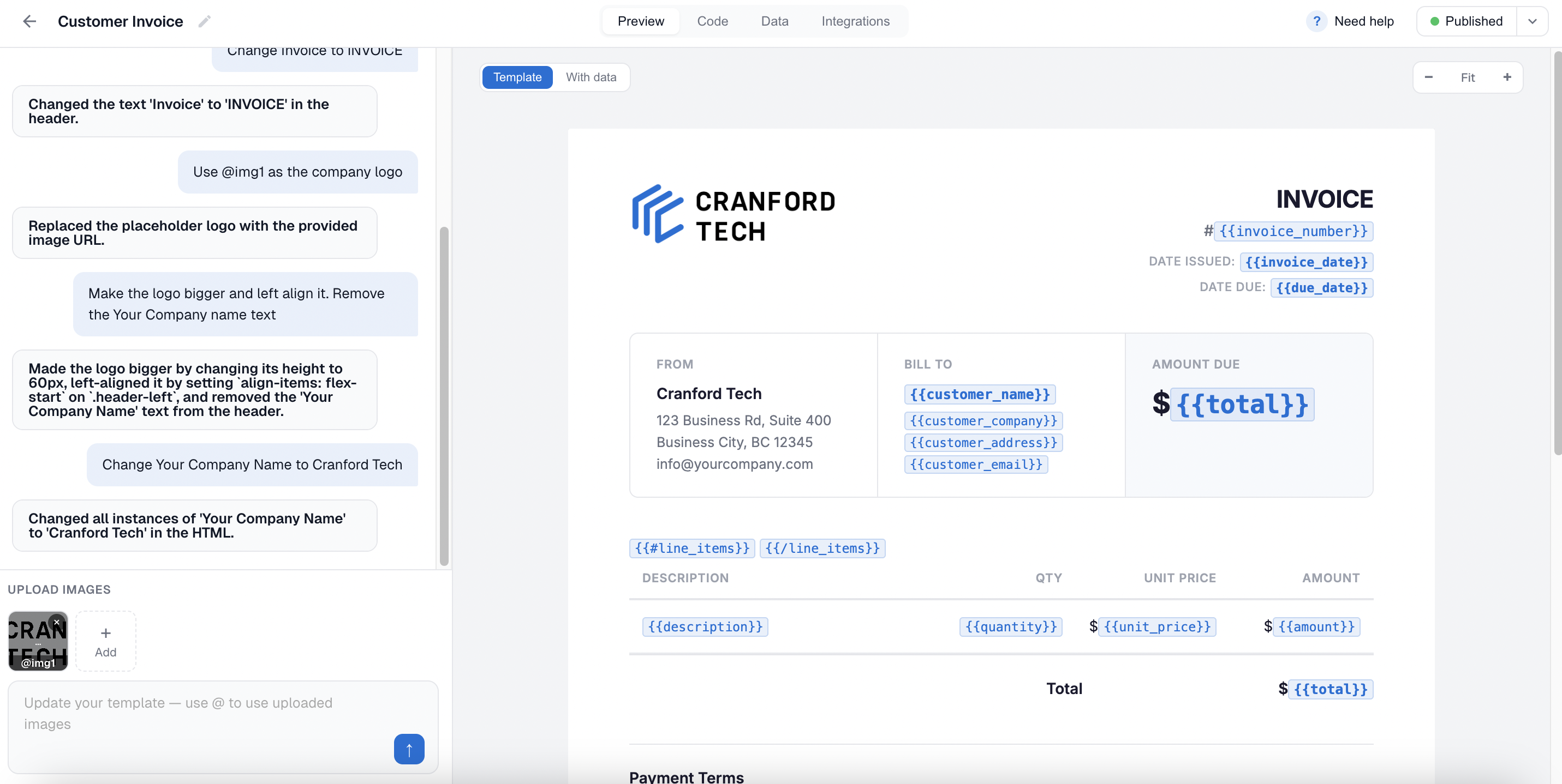 Anywhere you want dynamic data, the editor will insert a {{mustache}} variable — e.g. {{company_name}} , {{invoice_number}} , {{total}} . You can see and edit these in the Data tab at the top of the preview.