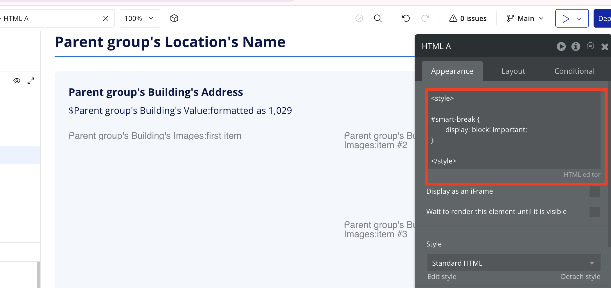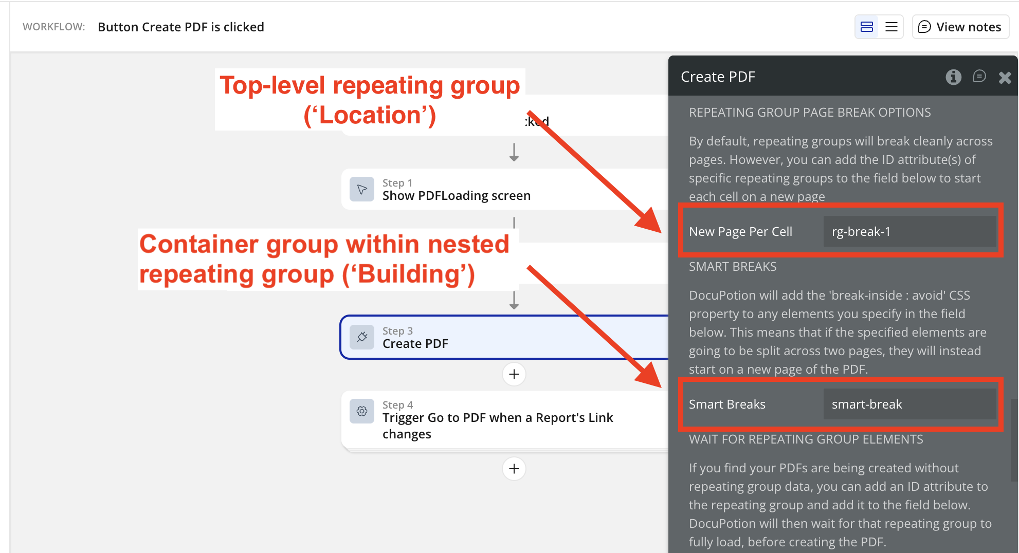 - An ID attribute for the Group within the nested Building repeating group to the Smart Breaks field