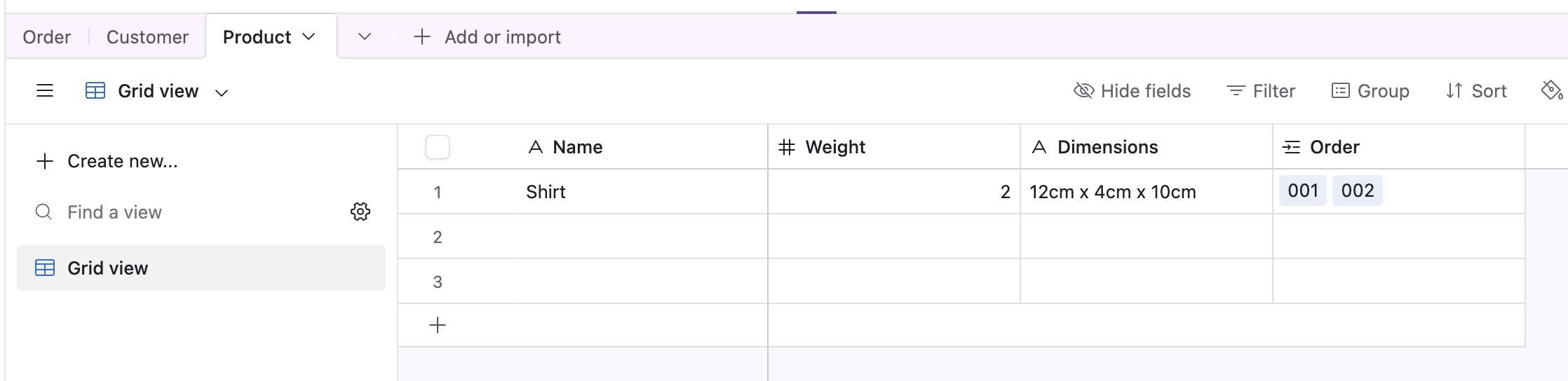 In the 'Order' table in the image below, the 'Customer' and 'Product' columns are linked to other tables in the base: