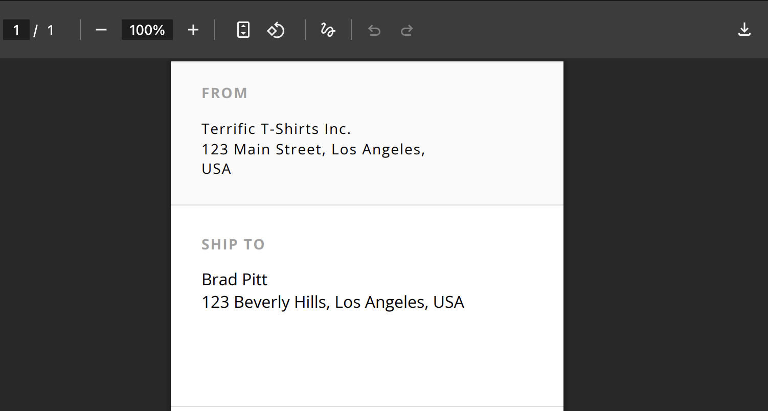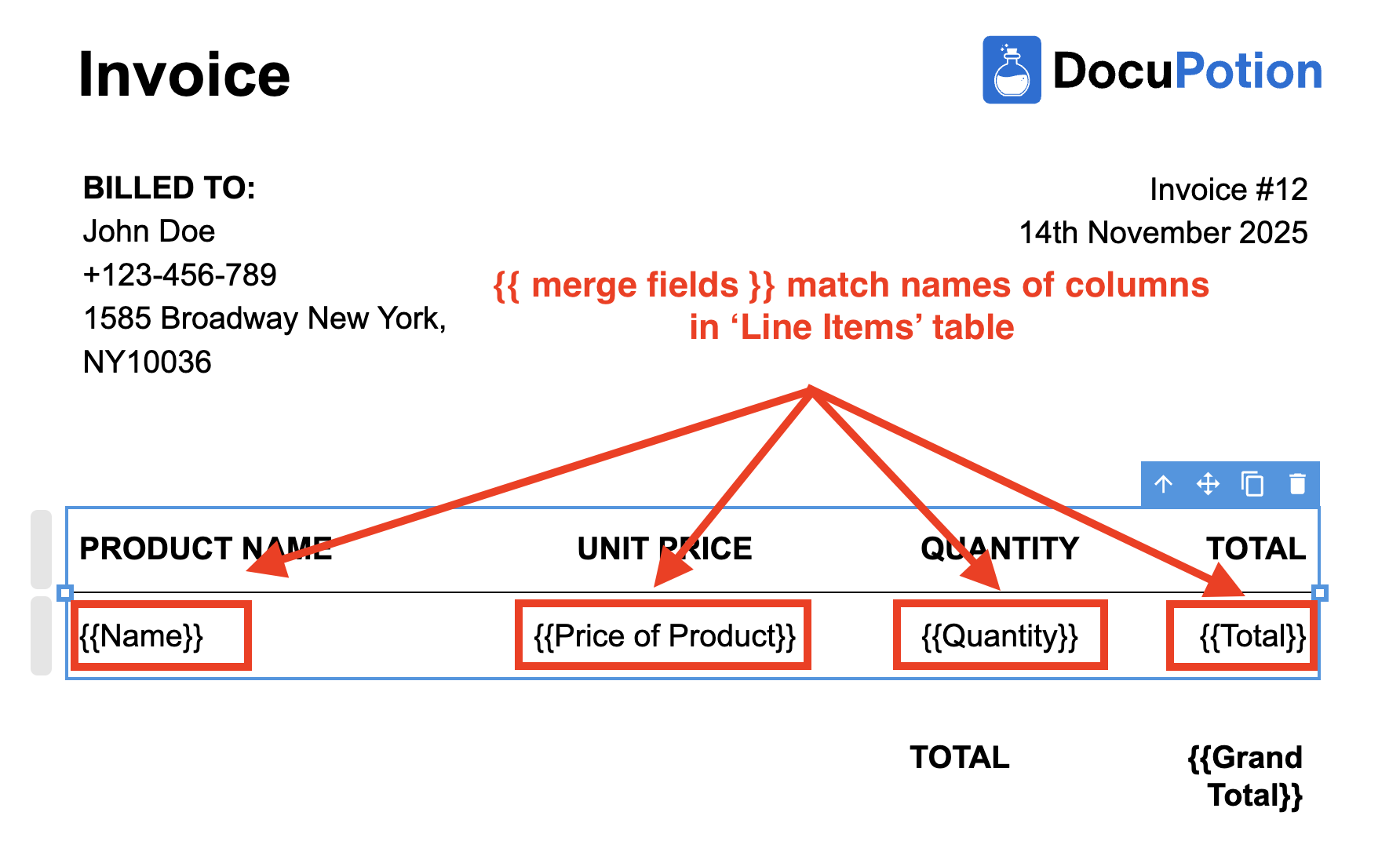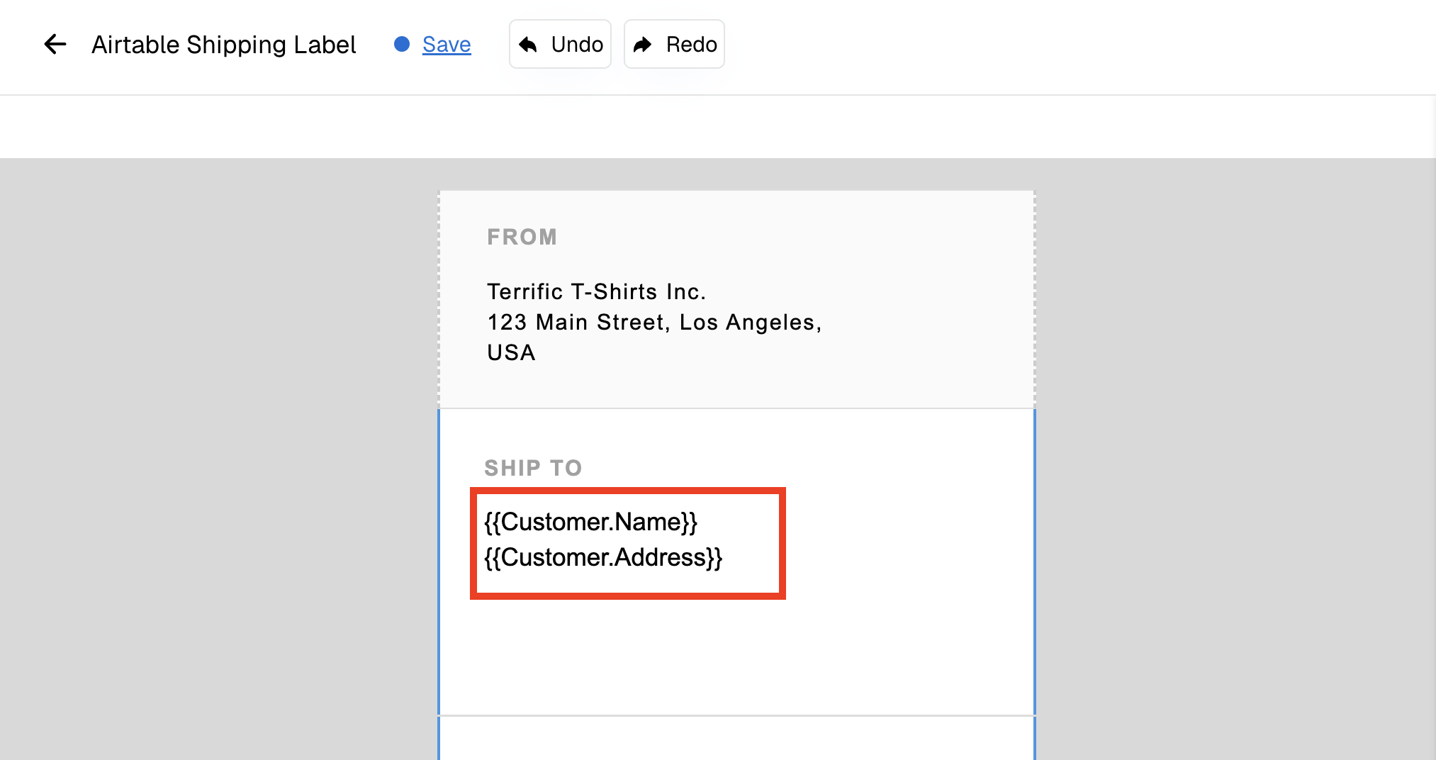 So if we want to include the Customer's name and address in the output PDF, we can use Customer.Name and Customer.Address when adding merge fields to our template