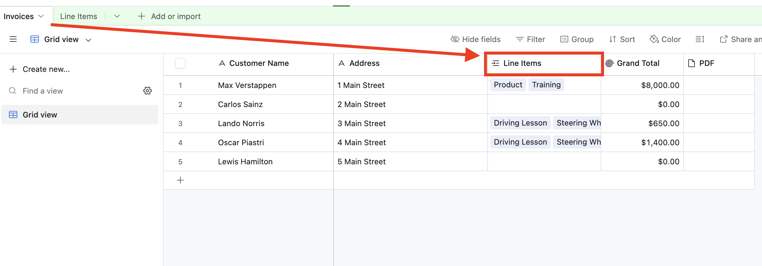 In the 'Invoices' table below, the 'Line Items' column links to the 'Line Items' table: