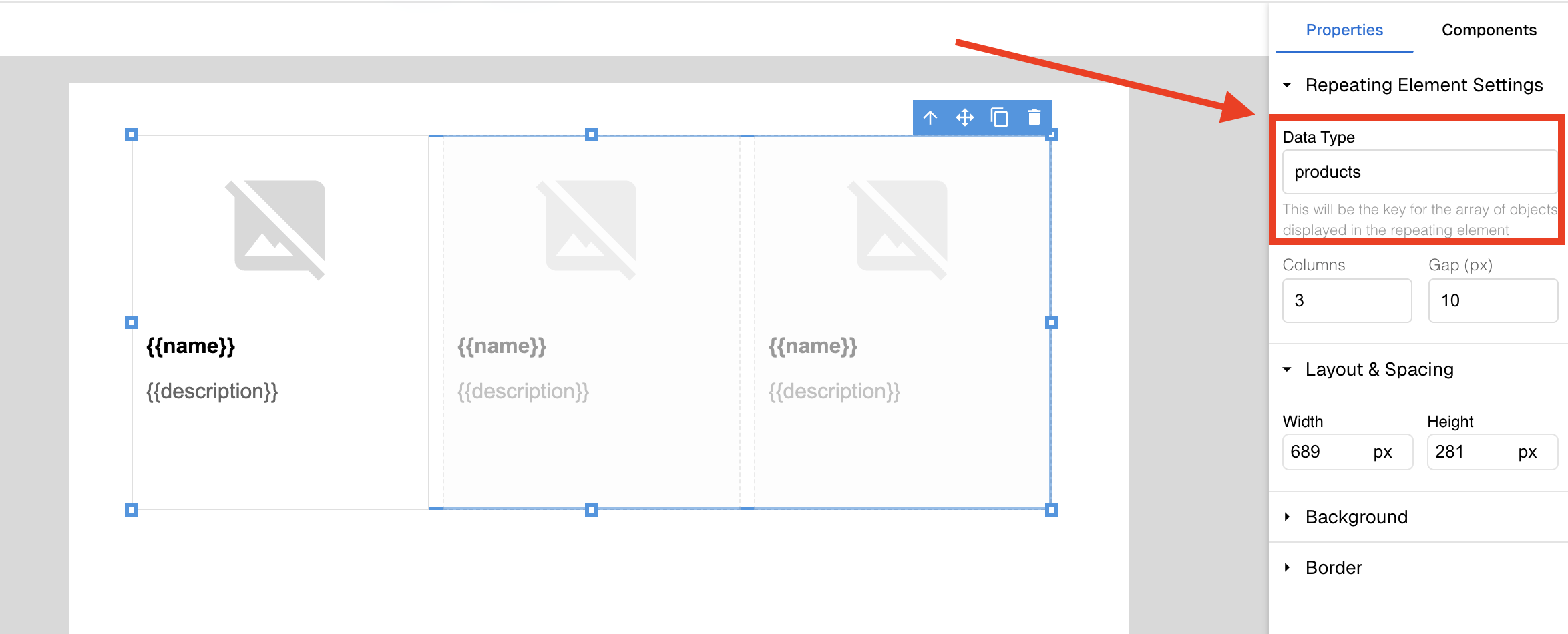 Think of it like a product catalog or photo gallery - you define how one product card looks, and the repeating element creates a card for each product in your list.